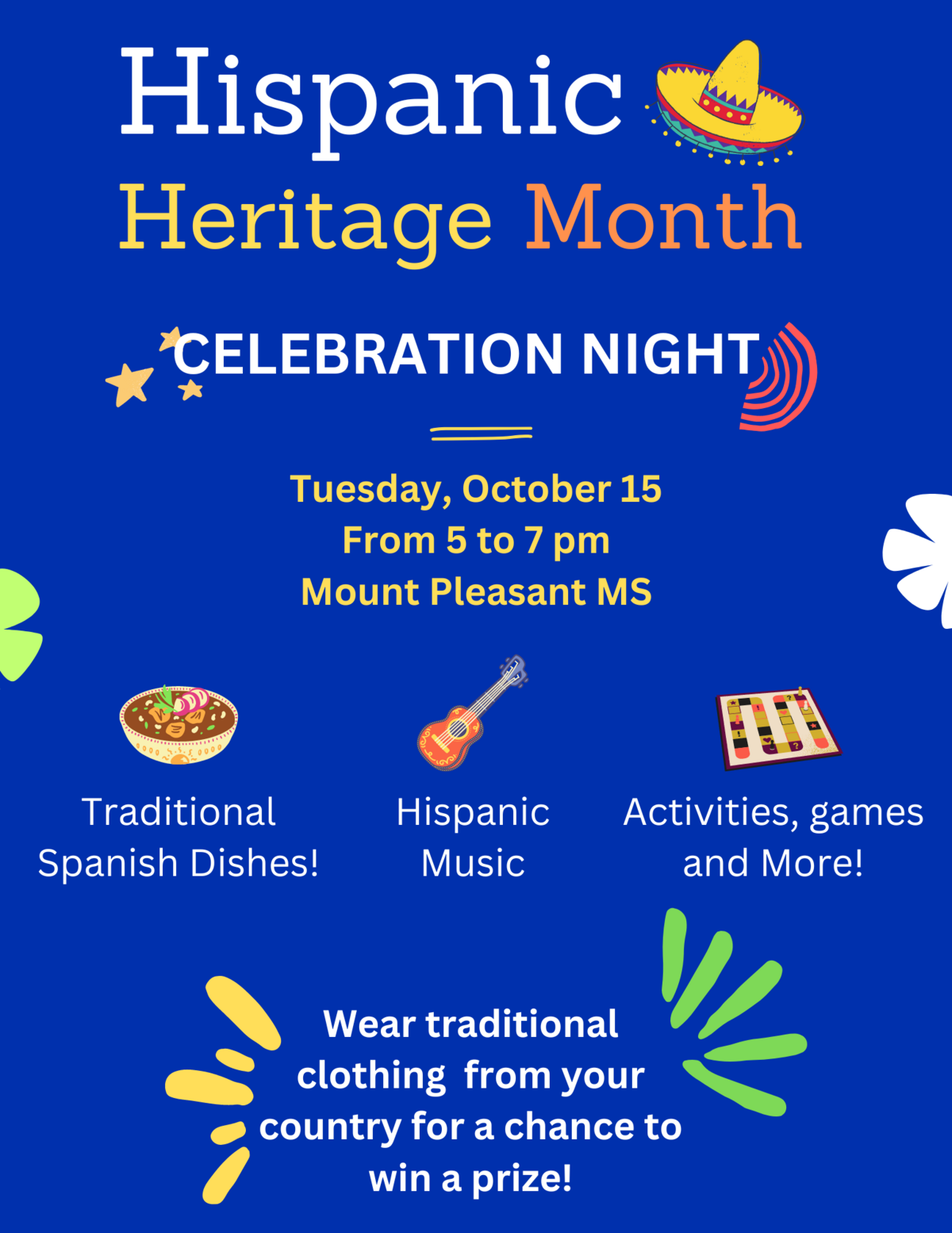We are thrilled to invite you to our Hispanic Night Celebration, marking the culmination of Hispanic Heritage Month. Our students have been working hard for weeks, brainstorming ideas and activities for this special event.