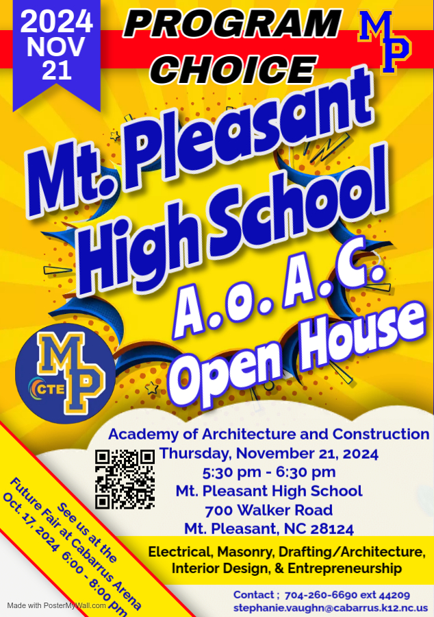 Mt. Pleasant High School's Academy of Architecture and Construction is hosting an Open House on Thursday, November 21, 2024 from 5:30 PM to 6:30 PM . The school is located at 700 Walker Road, Mt. Pleasant, NC 28124. The program consists of electrical, masonry, drafting/architecture, interior design, and entrepreneurship. Even if you are a student at MPMS, to be in the Academy, you must fill out the Program Choice Application and accept the seat. If you have any questions, please call 704-260-6690, extension 44209 or email stephanie.vaughn@cabarrus.k12.nc.us .