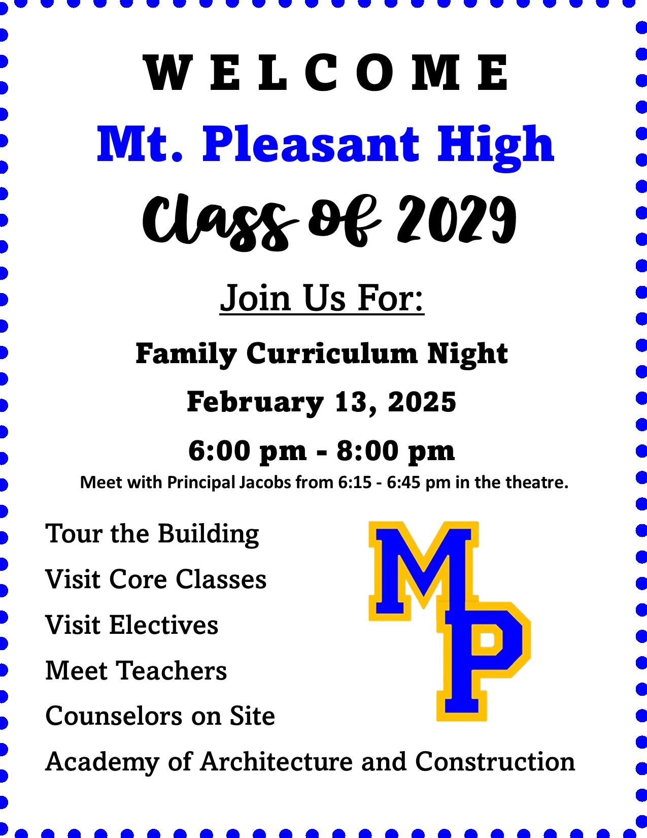 Time: 6:00-8:00pm (8th grade parents meet with Principal Jacobs at 6:15-6:45pm)