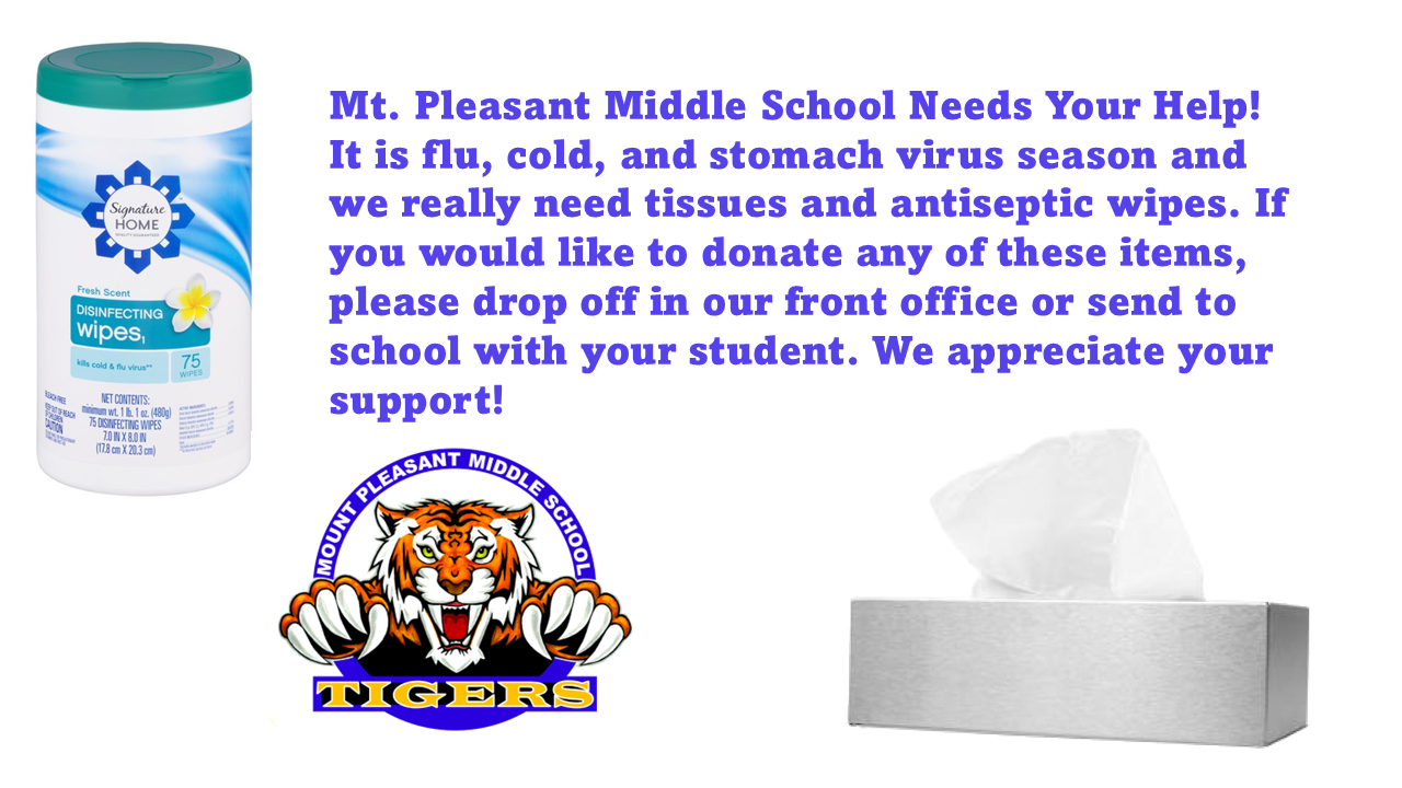 It is flu, cold, and stomach virus season and we really need tissues and antiseptic wipes. If you would like to donate any of these items, please drop off in our front office or send to school with your student. We appreciate your support!