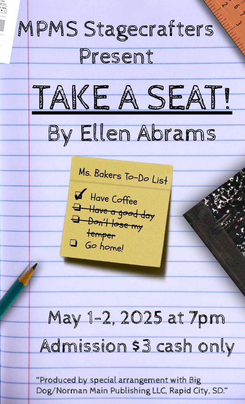 MPMS Stagecrafters Present Take A Seat! by Ellen Abrams on May 1 & 2 at 7pm. Admission is $3 cash only. The play is produced by special arrangement with Big Dog/Norman Main Publishing LLC, Rapid City, SD.